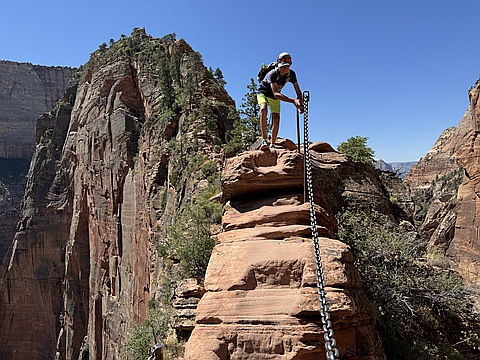 "It's a pretty steep climb to beginning of the narrow part of Angel's Landing. All of the super narrow parts are have heavy chains as railings. I'm pretty comfortable around heights but I never felt like I was really in danger of falling off the side. I would recommend everyone to do this trail even if they have an adversity to heights." — codyparks • Aug 17, 2021