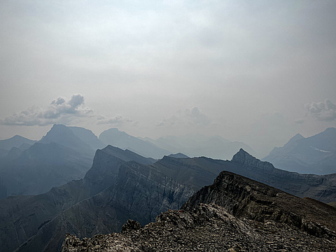 "Hiked Middle Sister from the Spray Lakes side so I could grab The Orphan as well. The trail is well travelled and route finding is easy. I don’t think I scrambled any sections, so this can be done as a hike. The only thing I’d do different is to stay skier right when dropping into the amphitheatre after The Orphan. I thought I could save some elevation lost by staying high and traversing left. This plan didn’t turn out to be very efficient. Good objectives for a smoky day. Finished with a swim in Spray Lakes Reservoir. " — ivo • Aug 7, 2023