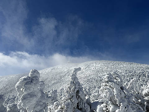 "Great weather to climb Cannon. The summit is always a little fickle, but we mostly had sunshine, lower 30s for a temp. We used spikes but above 3000 feet there is enough snow for shoes. The rime ice and recent snows have left the place looking like a winter wonderland." — Alohabuffy • Nov 19, 2025