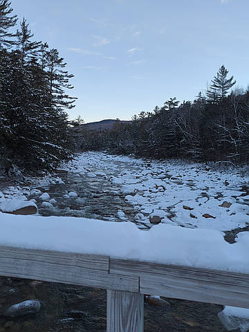 "With temperatures beginning just below zero, and warming up to only the mid-teens, this was easily the coldest hike I’ve ever embarked on. Setting off from the Lincoln Woods Trailhead at 7:45am we were treated to sunny skies and no wind, which made managing the cold quite easy. We only encountered one other brave soul throughout the entire hike, and it was a man returning from a quick morning walk with his dog. Roughly six inches of snow had fallen three days prior, and it was evident that very few people had gone down Lincoln Woods since then. Although we started the hike bareboot, we put on microspikes near the Osseo Trail junction because we kept slipping in the powdery snow. The scant tracks we were following turned onto the Black Pond Trail which is where we stopped to put on snowshoes. We reached the frozen Black Pond, which had a nice view of Bondcliff, then set off on the Black Pond Bushwhack. Despite not being an official trail, the Bushwhack seemed just as well-maintained as the marked section of the Black Pond Trail. In any event, it was more easily traversable than our next section of trail. The tracks turned left onto the Lincoln Brook Trail and we followed. This is wh..." — JCalautti • Dec 5, 2025