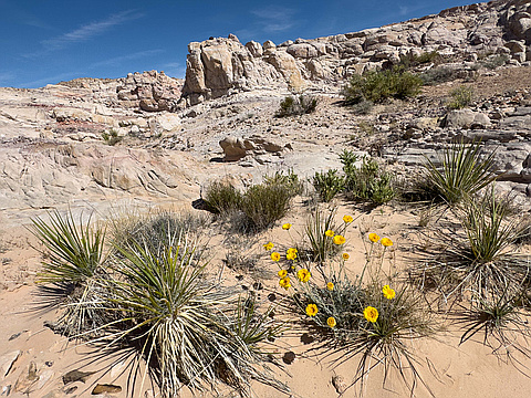 "Went out early to beat the heat & crowds. I parked at the Silica Dome trailhead & took the quick hike up there first. It has great views! I then hiked down the valley toward Baseline Mesa & explored some of the beautiful nearby areas. Went up a slope on the north side of Baseline Mesa. At the top, I had to hike about a 1/4 mile to the summit. The views were spectacular! I descended a different route on the north side through red sandstone. It was quite pretty & fun. I then looped back to Silica Dome. I saw two tortoises on the hike. The entire area is covered in flowers right now & there was a cool breeze making the day really wonderful. I forgot to turn on my GPS until halfway through, but the hike was about 6 miles with 1500 feet of gain." — StudioHoodoo • Apr 22, 2023