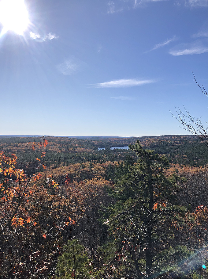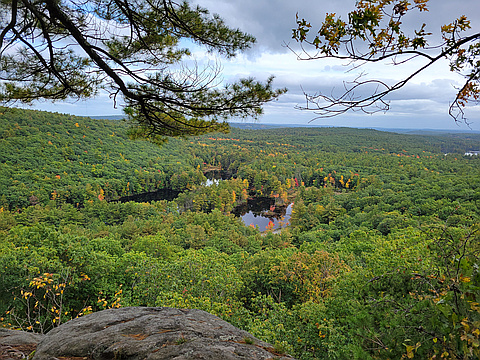 "Hiked up to the South summit from Redemption Rock via the Mid-State Trail. Took short unmarked trail to the South summit site. Good views from ledges looking east and south to lakes. Nice mostly cloudy fall day. " — Gregrog • Oct 9, 2021