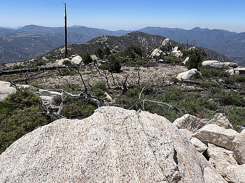 "I hiked the Iron, Roundtop, Granite, Rabbit loop counterclockwise from Monte Cristo campground. This is the highest of the four peaks and has a number of rocky outcroppings and pine trees that give it a higher elevation feel. After 10 minutes of searching, I finally found the register very well hidden underneath a big, slanty boulder. This register was way too hard to find; there were only three entries since 2014 and I know there's been more visitors than that. There were some Coulter Pines with their giant pinecones just below the summit. " — klotito • Apr 1, 2017