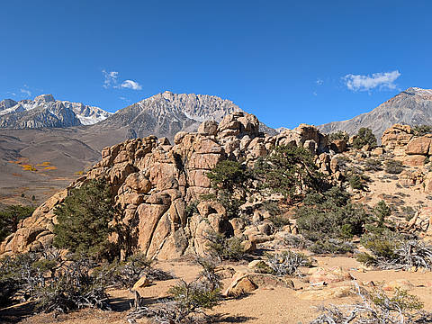 "Hiked from our campsite near the main bouldering area.I followed the dirt road to the base of the mountain, crossed the creek and followed the bouldery ridge to the summit. Went straight down the sandy gully at the saddle on the north side, eventually meeting back up with the road on the other side of the creek. Beautiful day to be up there." — beaucheminjess • Oct 23, 2025