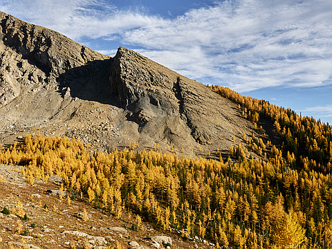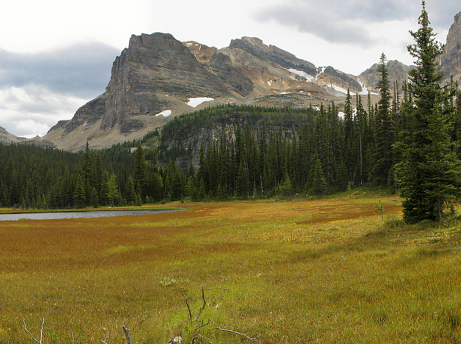 "Haiduk Peak was scenic but a bit of a sufferfest. Starting from the Floe Lake trailhead, we hiked 4 km up the Hawk Creek trail before descending to the creek and then ascending a drainage to the north peak of Hawk Ridge. We followed the ridge south over the next highpoint before dropping down into the valley and making our way across to ascend the ridge that connects to the Haiduk-Scarab col. This ridge turned out to be less straightforward than hoped, and to avoid numerous drop-offs we spent much of the ridge traversing around the right side. Eventually it connected to the col and we were rewarded with fantastic views over to the Banff side.