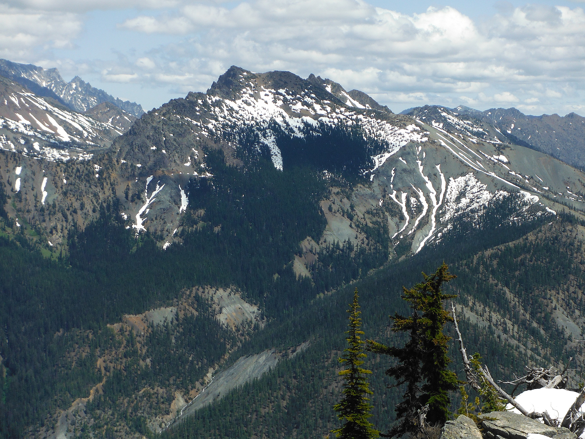 "I hiked solo to the summit of Hawkins Mountain, also hitting smaller peaks NW and S of the main peak. I went by the Camp Creek Road / Trail (305 on USGS map), where I found a lot of Serpentine rocks. These are dark green ocean-floor rocks with distinctive white serpentine lines. The trail becomes unreliable above 5600 ft, but bushwhacking and navigating by sight is reasonably easy. The view at the top of Mt Stuart and the surrounding landscape is fabulous.