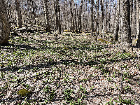 "Parked at the Rider Hollow Trailhead. Started bushwhacking immediately. Stayed along the New York State boundary markers on the trees (yellow blazes) until the corner of the property then stayed at the 2600’ contour until the saddle of Hiram’s Knob and Haynes Mtn. A short climb to the top from the col. The ramps were out, so I harvested some on the way back. Delicious! " — climbmtnsdmg • Apr 29, 2022