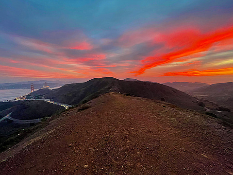 "Mixed it up with some trailrunning outside of my usual routes in the Headlands. Started at Golden Gate Bridge and did a clockwise loop into fading light. Haze in the air from millions of fireplaces made for 100 AQI and a highly-saturated sunset. Almost bit it twice in last 5 min of run as could barely see the ground anymore in the dark." — scott • Dec 9, 2020