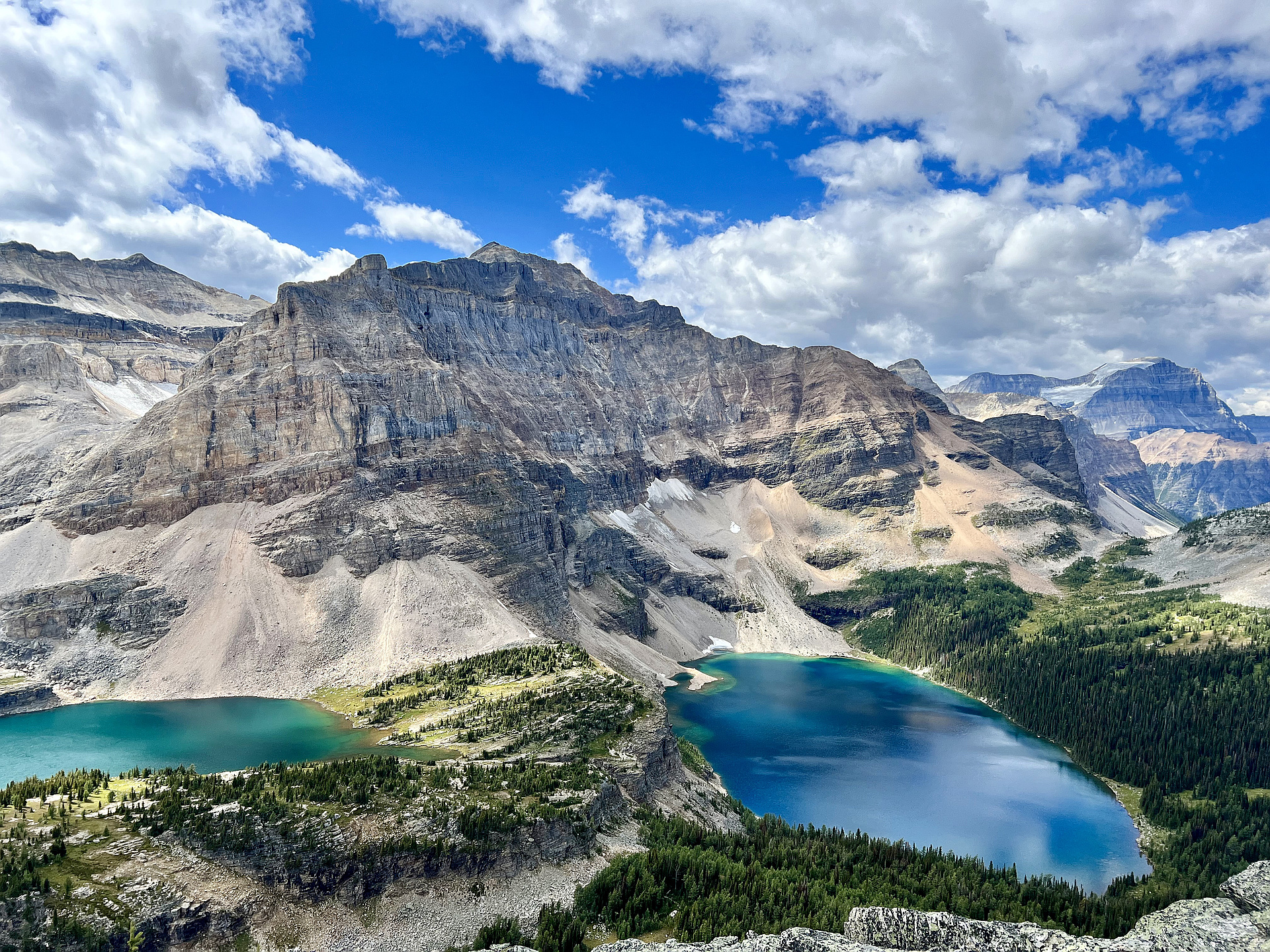 "Scarab Peak was a long but very stunning trek in the Egypt Lake area. From the Sunshine parking lot we hiked over Healy Pass, down past the Egypt Lake campground and then up to Mummy Lake before the scrambling even got started. After a quick stroll around the lake, we ascended scree and rubble up to the first glacier. Most of this glacier could be crossed by stepping on rubble, but we all put on micro-spikes/crampons for the steeper top part. From there, we headed up to the south ridge, next to an upper glacier and followed the ridge to the summit for some lounging and trash talk. After descending back down to Mummy Lake, Babette & I still had the energy/insanity to head up The Sphinx for some different views, while Lito & Rob limped back over Healy Pass.