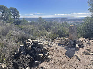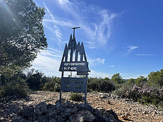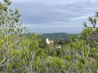Continuing your ascent, you eventually reach the Puig de Sant Antoni, the highest point in the region at 408 meters. At the summit, a concrete structure marks the peak, a small but significant testament to the climb you’ve just completed. From this vantage point, you're treated to stunning views of the surrounding landscape, including the impressive Puig Lleó at 312 meters and the picturesque les Torretes at 251 meters.