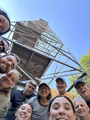 "Great weather (upper 70’s and sunny) the entire weekend. We had the whole gang with us for our annual camping trip with friends from downstate. Couldn’t go up the tower as it was shut, but still had a nice picnic lunch at the summit. Picked up some trash we saw on the way down. Brought a baby bottle of champagne with us to the top to celebrate completing the challenge.
