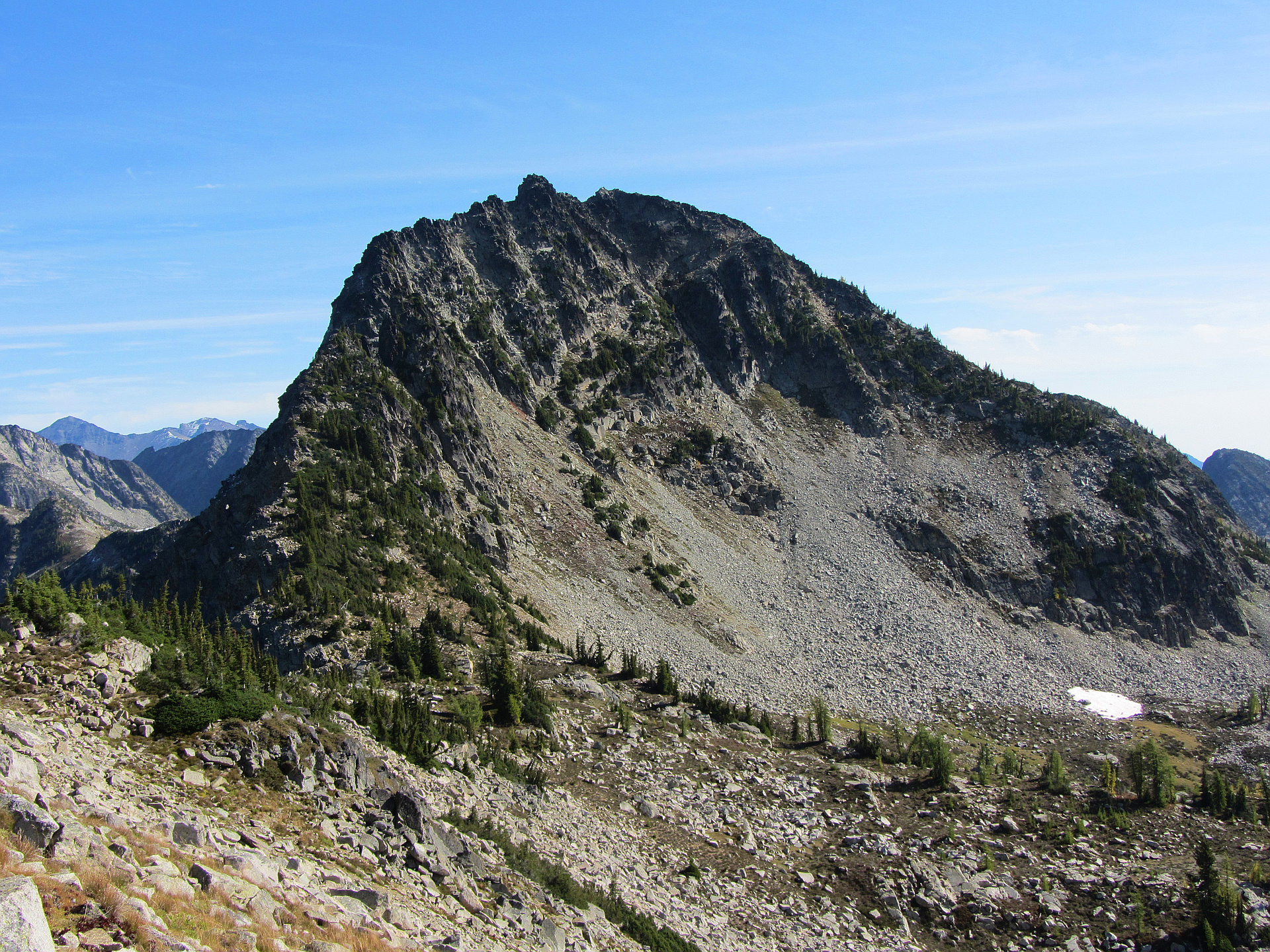 "A tough solo. Not seeing a single person out here all day added a level of mental intensity. Booked it up the never-ending switchbacks and meadows and made it to the old Stiletto Lookout in 2 hours. Although forecast to be sunny all day, some clouds started forming in the distant west. They didn't look that menacing so I decided to press on to the summit. My plan had been to scramble up the west ridge to the summit of Stiletto (shown in the main peak photo), but I couldn't pick out a completely obvious route so instead decided to descend to the south face which looked more gradual. Turns out it wasn't that gradual and was a total beat-down: a scramble up loose talus and scree up a series of gullies requiring serious concentration. Cresting a final loose dirt/scree gully, I popped up on top and was relieved to find I had stumbled onto the true summit (note: it's not the point that looks highest from the Lookout, it's to the right of that). But after only a minute on top, I felt raindrops and the entire western sky had grown dark -- time to get outta there. Down-climbing the scree slopes was tedious and energy-sapping, but I couldn't allow myself to rest; winds were picking up and th..." — scott • Sep 30, 2011