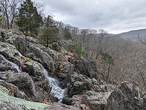 "Since this was a "reverse" hike (with the trailhead being at the summit and winding down to a waterfall) I decided to hike the quarter-mile to and from the high point and then drove to a Walgreens in Ironton until a tornado watch cleared up. I began around 1:45 PM and reached the Mina Sauk Falls roughly 45 minutes later. The trail was rocky and wet, but that was worth it since the waterfall only flows during wet weather (a thunderstorm had blown through earlier in the morning). The trail also offered occasional views of the Taum Sauk Mountain State Park. The hike back to the trailhead was drier and the waterfall's tributary flowed on the right." — JCalautti • Mar 31, 2023