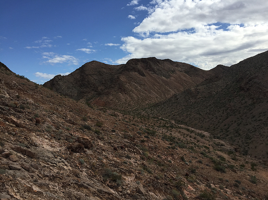 "The weather forecast had a high chance of rain in the afternoon, so Dylan & I started early with the hope of being able to complete a short 4-peak loop before it got bad. We parked off of Lake Mead Rd and took a dirt road to the base of The Minefield, which we ascended via the SW Slope. From there, we descended the North Face back down, then ascended The Triple via a bit South of the East Ridge. We descended the East Ridge, then went up the West Ridge of The Double. There was a strange circle on the hillside north of The Double, so we took the North Slope down to check it out, then made our way across the desert gullies to the base of Coyote Skull Peak, which we gained via the East Ridge. We descended the same way and made our way back to the dirt road to complete the loop. Weather held up pretty well until our descent of Coyote Skull Peak, where we finally had to deal with some pretty strong wind gusts. No rain until we were in the car driving back to the city. " — Kevin • Mar 6, 2016