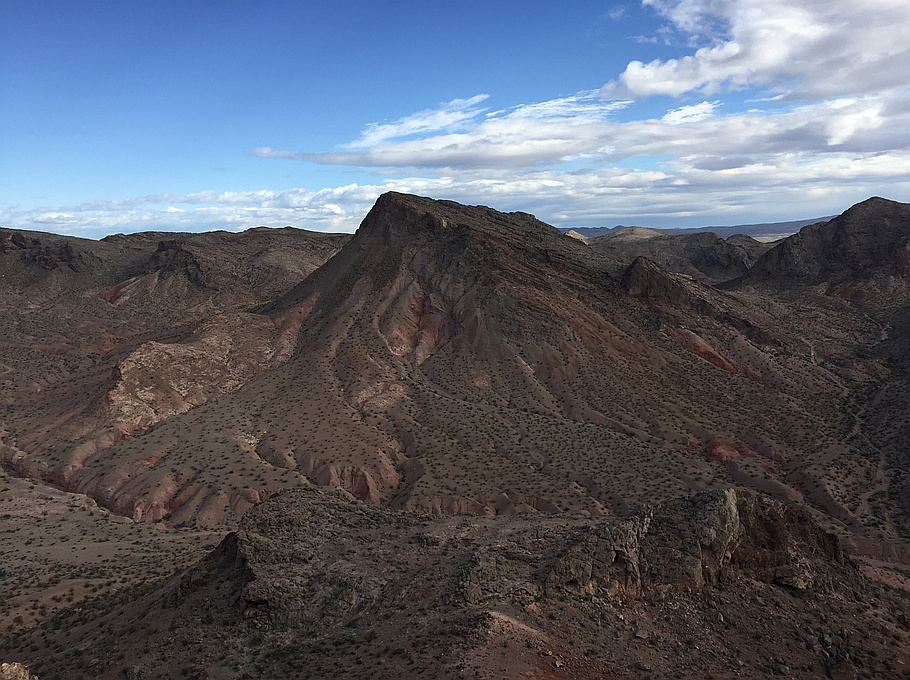 "The weather forecast had a high chance of rain in the afternoon, so Dylan & I started early with the hope of being able to complete a short 4-peak loop before it got bad. We parked off of Lake Mead Rd and took a dirt road to the base of The Minefield, which we ascended via the SW Slope. From there, we descended the North Face back down, then ascended The Triple via a bit South of the East Ridge. We descended the East Ridge, then went up the West Ridge of The Double. There was a strange circle on the hillside north of The Double, so we took the North Slope down to check it out, then made our way across the desert gullies to the base of Coyote Skull Peak, which we gained via the East Ridge. We descended the same way and made our way back to the dirt road to complete the loop. Weather held up pretty well until our descent of Coyote Skull Peak, where we finally had to deal with some pretty strong wind gusts. No rain until we were in the car driving back to the city. " — Kevin • Mar 6, 2016